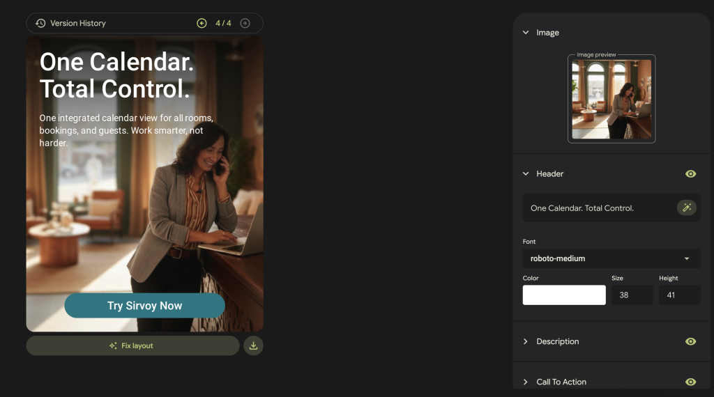 Pomelli starts with your website, so having one is the first step. If you don’t yet, Sirvoy’s website builder lets you create a clean, professional site quickly, with a built-in booking engine that lets guests book directly.